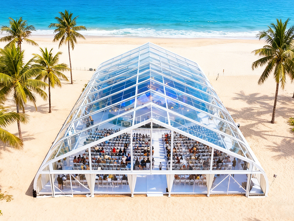 桃型篷房的弧形頂設(shè)計(jì)借鑒了房屋屋頂?shù)牧骶€型理念,外觀優(yōu)雅時(shí)尚,線條流暢如跳動(dòng)的音符,能有效吸引目光,提升活動(dòng)格調(diào)。其弧形結(jié)構(gòu)不僅是為了美觀,更蘊(yùn)含空氣動(dòng)力學(xué)智慧,可增強(qiáng)抗風(fēng)能力,避免傳統(tǒng)四角篷房易受風(fēng)力影響的弱點(diǎn)。篷房?jī)?nèi)部采用無柱大跨度設(shè)計(jì),空間利用率高,可根據(jù)活動(dòng)需求靈活布局,無論是展覽、婚禮還是商業(yè)促銷,均能提供開闊且無障礙的場(chǎng)地。