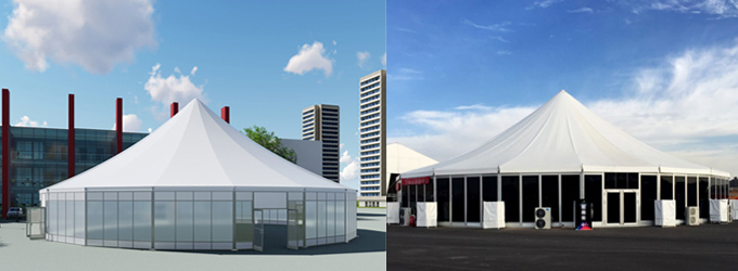 適合搭在較大地面上的多邊形篷房,造型別致,遠(yuǎn)遠(yuǎn)就能看見,且內(nèi)部空間寬敞,輕松裝下幾百個(gè)標(biāo)準(zhǔn)攤位,尤其適合北方地區(qū)的大型展銷會(huì)和集市。