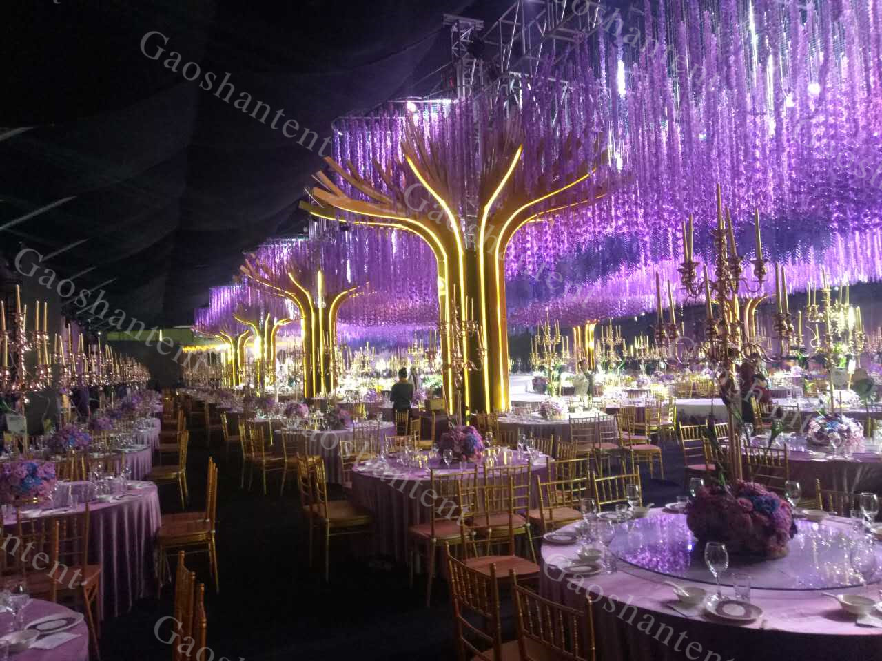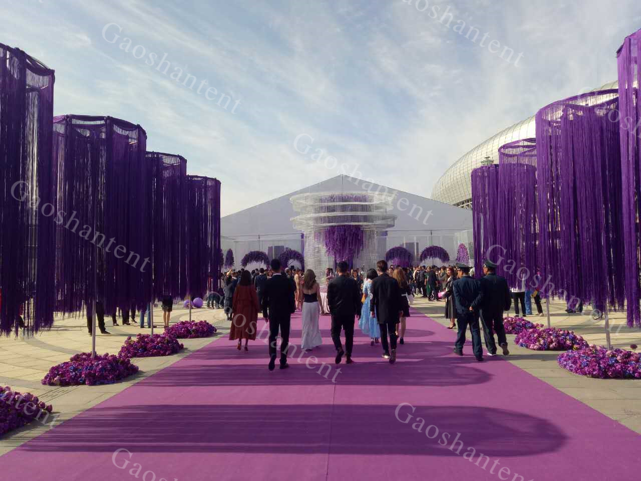 高山篷房還可量身定制進(jìn)行篷房的布置和提供配套服務(wù)。篷房?jī)?nèi)的空調(diào)、地板、燈光等為基本配置,高山還能用布幔、擺設(shè)等將其布置成五星級(jí)酒店大廳,并提供舞美、表演、樂(lè)隊(duì)等配套服務(wù)。