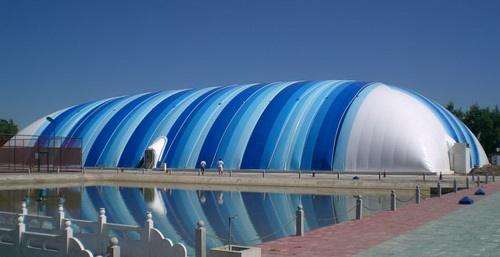 氣膜結(jié)構(gòu)建筑每平米自重約3公斤,可以建在樓頂全天候使用的充氣體育館或展覽館。