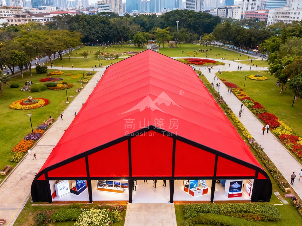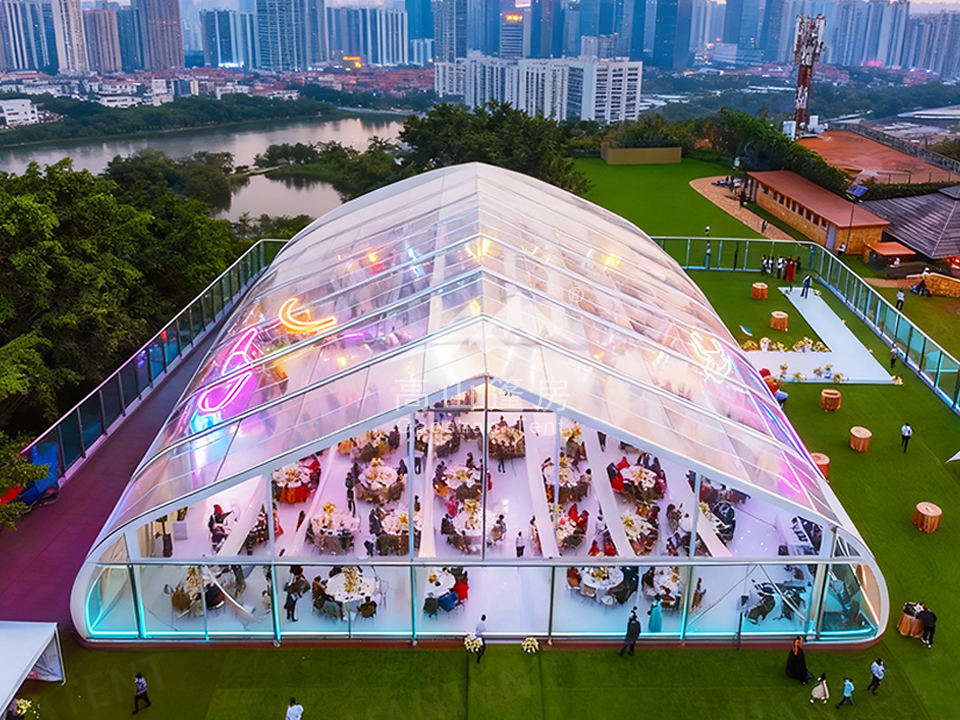 環(huán)境控制:空調(diào)、通風(fēng)系統(tǒng)、保溫墻體,保障內(nèi)部舒適;功能擴(kuò)展:透明PVC窗、玻璃幕墻、木地板、照明設(shè)備;安全防護(hù):防雷、排水槽、加固錨釘,應(yīng)對(duì)惡劣天氣。這種靈活性使桃型篷房適配婚禮慶典、展覽展會(huì)、體育賽事、應(yīng)急避難等上百種場(chǎng)景,實(shí)現(xiàn)“一篷多用”。
